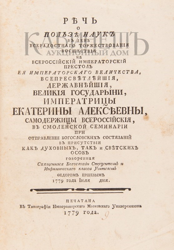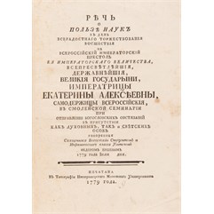 Хвалебная речь доктора медицины Федора Петровича Ершова. Издание содержит виньетку с аллегорическим сюжетом, на оборотной стороне титульного листа – издательская марка Н. Новикова.