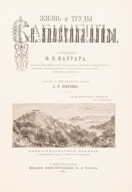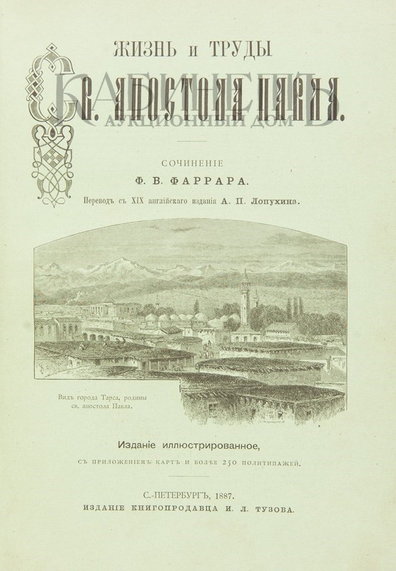 Фаррар Ф.В. Жизнь и труды св. Апостола Павла. Перевод с XIX английского издания А.П. Лопухина. Иллюстрированное издание, с приложением карт и более 250 политипажей. сПб., издание книгопродавца И.Л. Тузова, 1887.