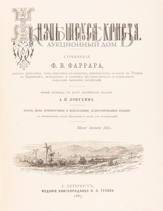 Фаррар Ф.В. Жизнь Иисуса Христа. Новый перевод с 30-го английского издания А.П. Лопухина. Второе, вновь просмотренное и исправленное, иллюстрированное издание с приложением карты Палестины и более 300 политипажей. сПб., издание книгопродавца И.Л. Тузова, 1887.