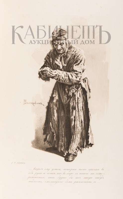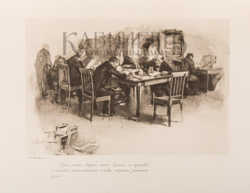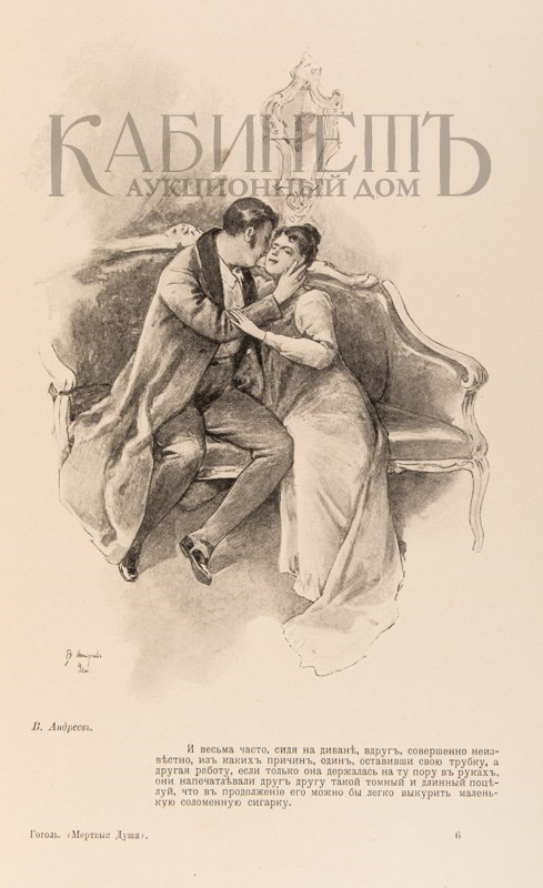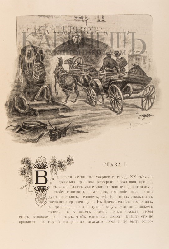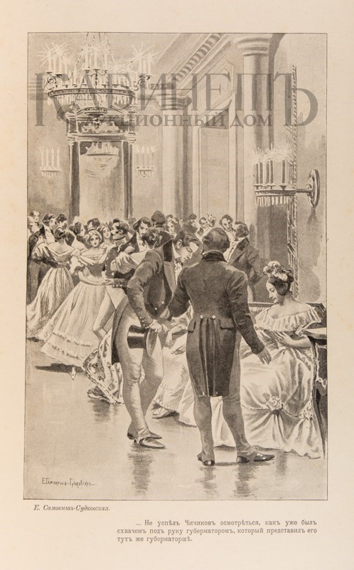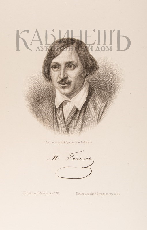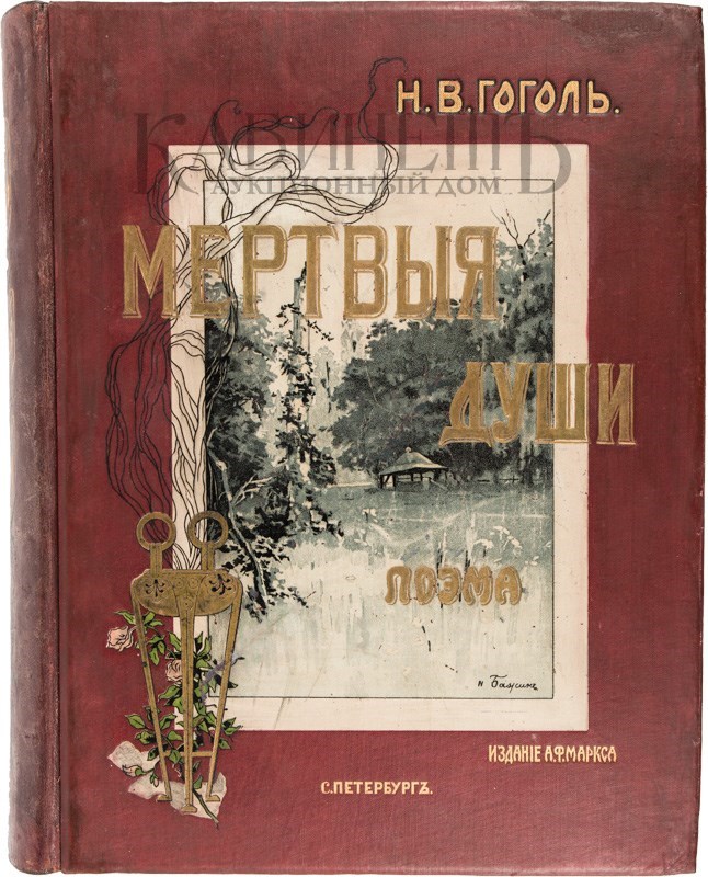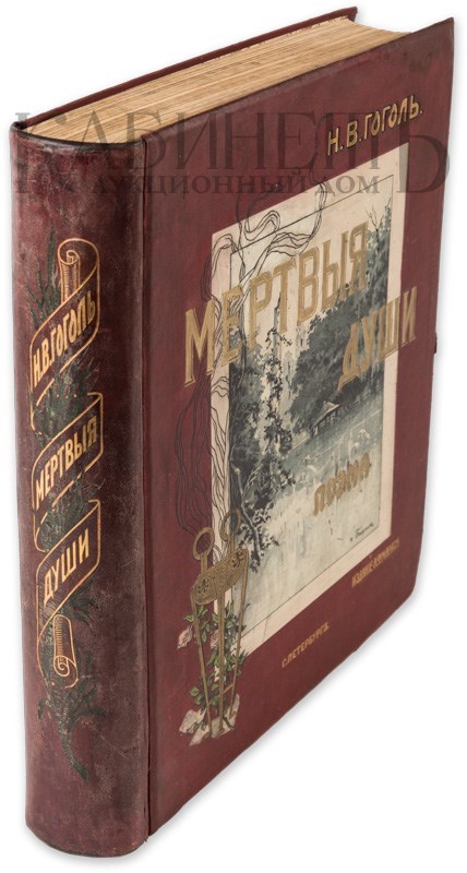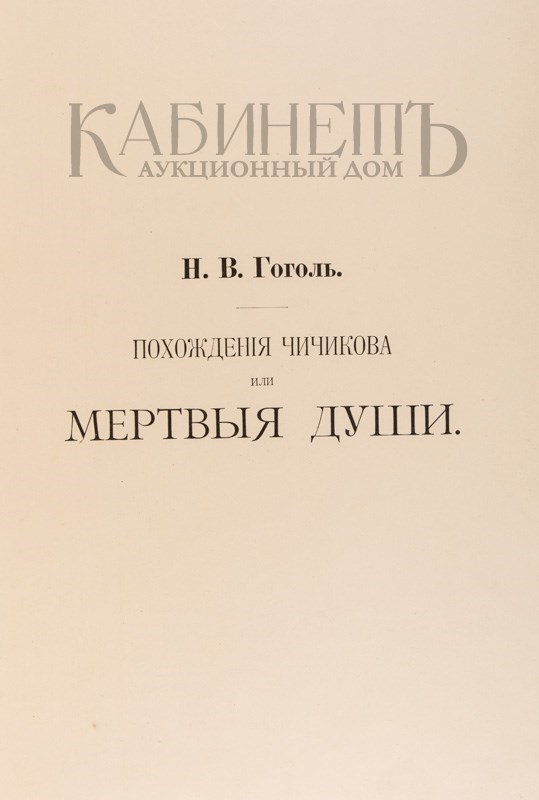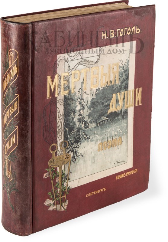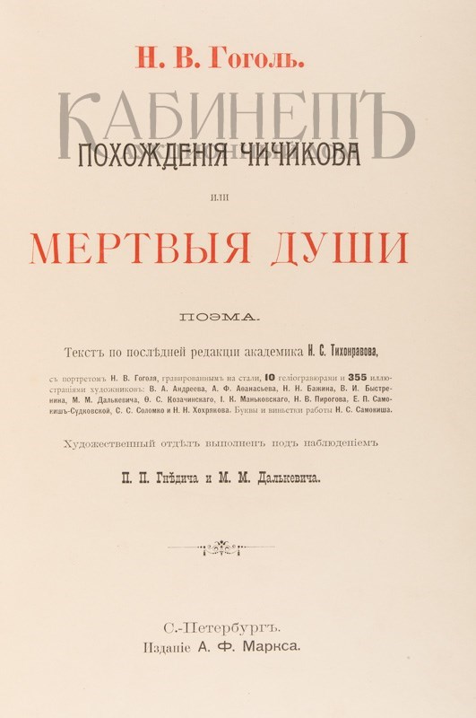 Архив аукциона №27(78) Лот 80 Гоголь Н.В. Похождения Чичикова или Мертвые души. Поэма. Текст по последней редакции академика Н.с. Тихонравова с портретом Н.В. Гоголя, гравированным на стали, 10 гелиогравюрами и 355 иллюстрациями художников: В.А. Андреева, А.Ф. Афанасьева, Н.Н. Бажина, В.И. Быстренина, М.М. Далькевича, Ф.с. Козачинскаго, И.К. Маньковскаго, Н.В.Пирогова, Е.П. самокиш-судковской, с.с.соломко и Н.Н. Хохрякова. Буквы и виньетки работы Н.с.самокиша. Художественный отдел выполнен под наблюдением П.П. Гнедича и М.М. Далькевича. сПб., издание А.Ф. Маркс, [1900].