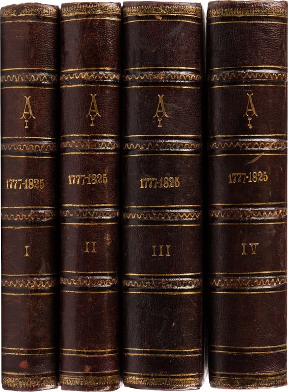 Экземпляр в старинных полукожаных переплетах с золотым тиснением по верхним крышкам и корешкам. Бинты. Крапленые обрезы. Муаровые форзацы. Реставрация переплетов (корешки и уголки дублированы на современную кожу), временные пятна в томе I, II, подклейка полей авантитула и титульного листа в томе I, II, III, фрагментов отдельных страниц в томе I, II. В томе I с. 7-8 вплетена между 1-2 и 3-4. В томе II с. 151-152 вплетена между с. 145-146 и 147-148. В томе IV подклеен авантитул, пятна на обороте последней страницы.