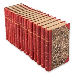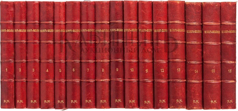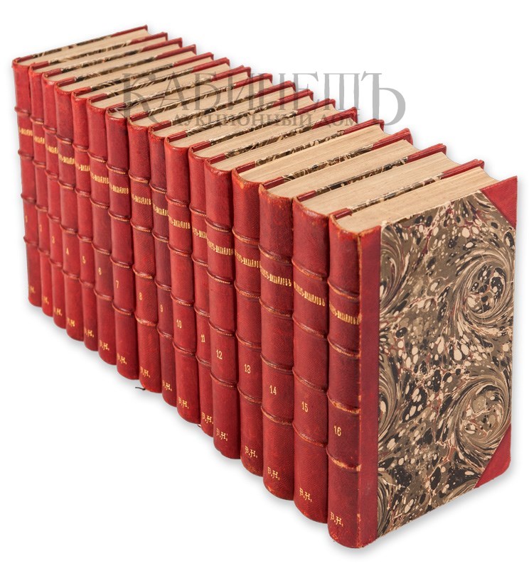 Экземпляр в 16-ти старинных владельческих полукожаных переплетах с золотым тиснением и бинтами на корешках. Незначительные потертости переплетов, «лисьи» пятна, блоки подрезаны, букинистические штампики. В томе XV реставрация с. 577-578 (подклейка бумагой, утрачен текст в верхнем поле), утрачены с. 583-584, 585-586.