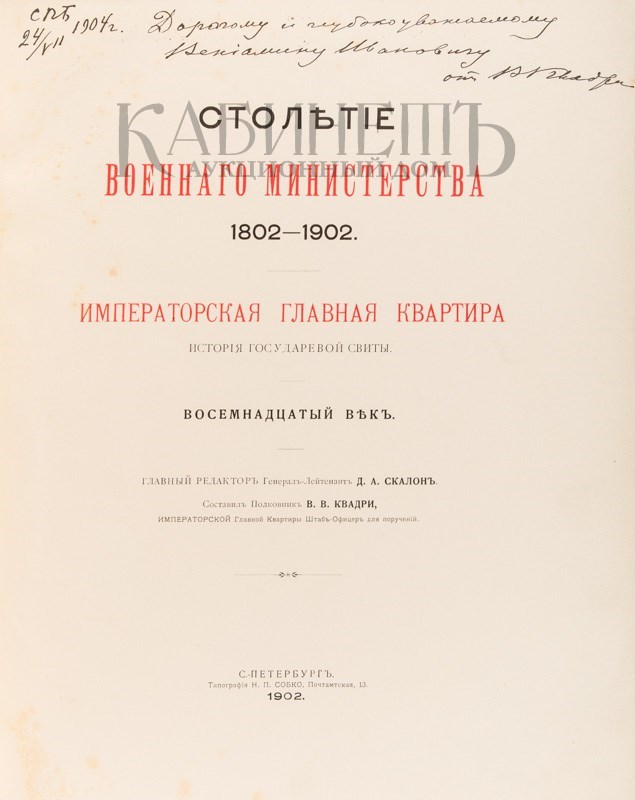 Cкалон Д.А., Квадри В.В. столетие военного министерства 1802–1902. Императорская главная квартира. История государевой свиты. Восемнадцатый век. [Том II, книга I]. сПб., типография Н.П. собко, 1902.