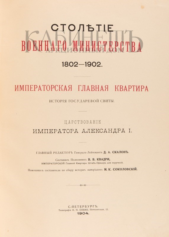 Квадри В.В., соколовский М.К., скалон Д.А. столетие военного министерства 1802–1902. Императорская главная квартира. История государевой свиты. Царствование Императора Александра I. [Том II, книга II]. сПб., типография Н.П. собко, 1904.