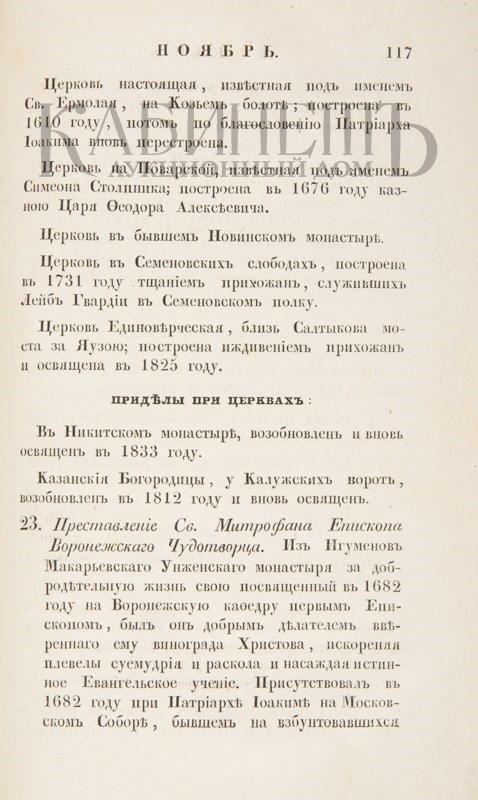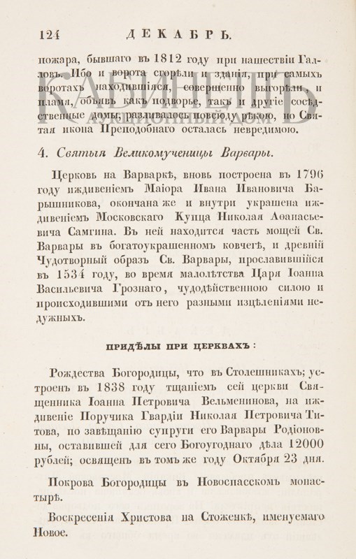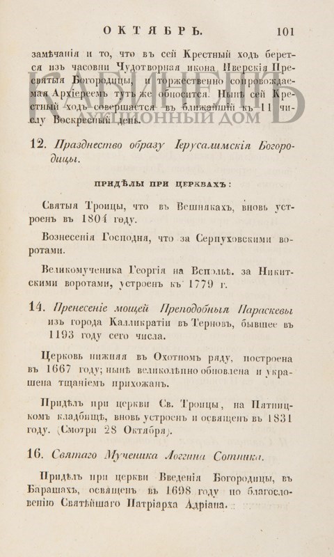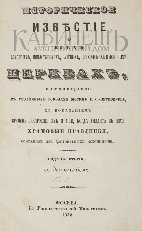 Историческое известие о всех соборных, монастырских, ружных, приходских и домовых церквах, находящихся в столичных городах Москвы и Санкт-Петербурге, с показанием времени построения их и того, когда бывают в них храмовые праздники, собранное из достоверных источников. Издание второе, с дополнением. М., В университетской Типографии 1848.