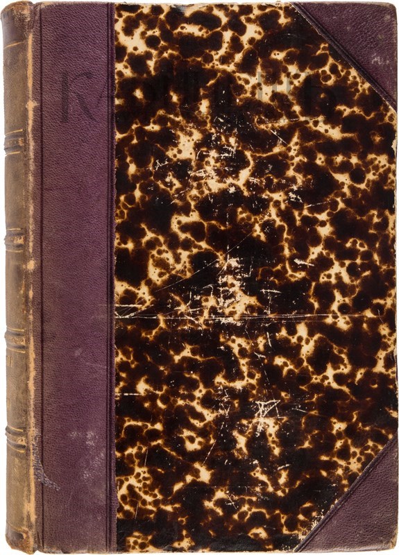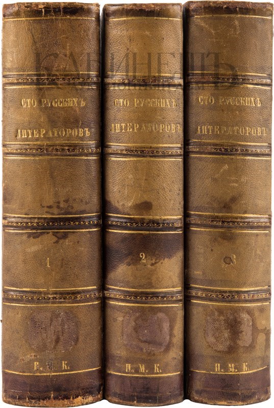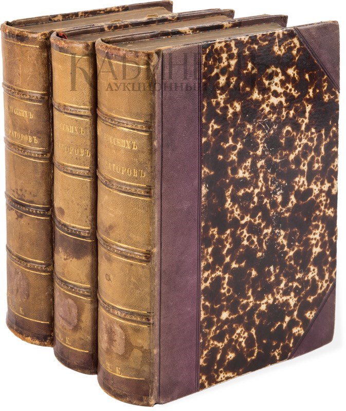 Экземпляр в трех старинных полукожаных переплетах с золотым тиснением по корешкам. Форзацы из бумаги «под павлинье перо». Потертости переплетов, «лисьи» пятна, утрата авантитула тома I, II, утрата портрета А.А. Бестужева и нескольких защитных калек в томе I (портрет изымался цензурой, поэтому обычно на рынке встречаются экземпляры без портрета), подклейка маленьких фрагментов на полях отдельных страниц тома II (редко).