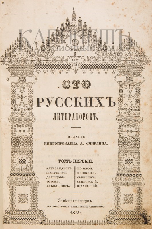 Том I: Александров. Бестужев. Давыдов. Зотов. Кукольник. Полевой. Пушкин. Свиньин. Сенковский. Шаховской. – 1839. – III-VIII, [4], 830 с., 19 из 20 л. ил., портр.