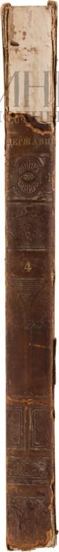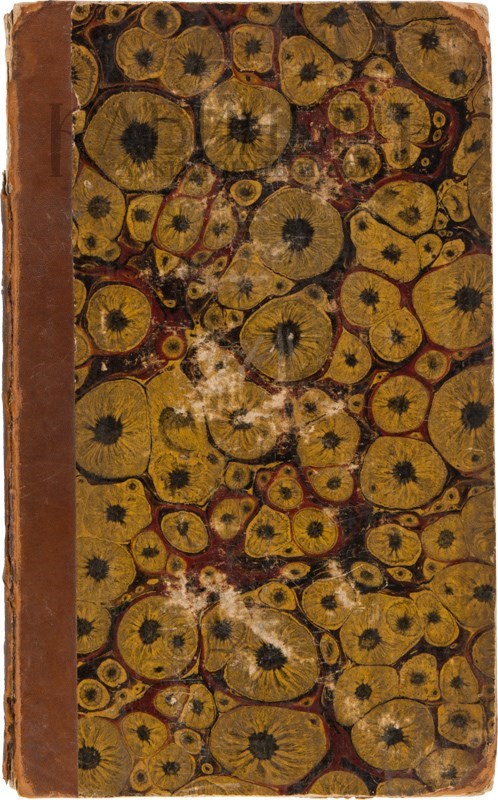 Экземпляр в старинном полукожаном переплете с остатками золотого тиснения по корешку, фрагментарные утраты корешка, потертости, незначительный разлом внутри книги.