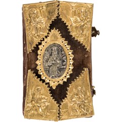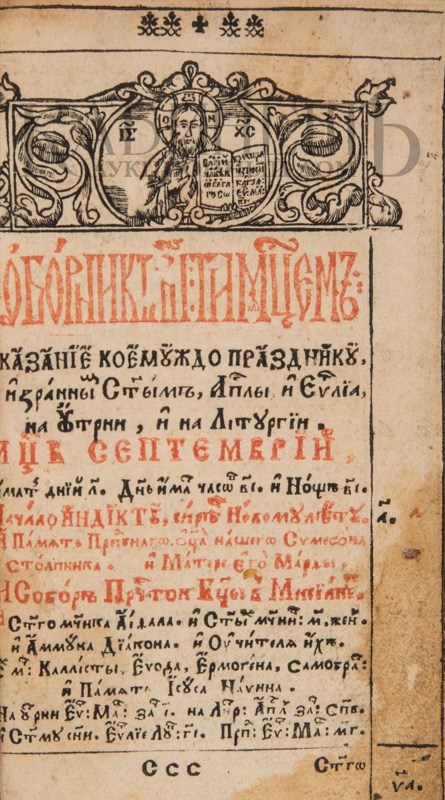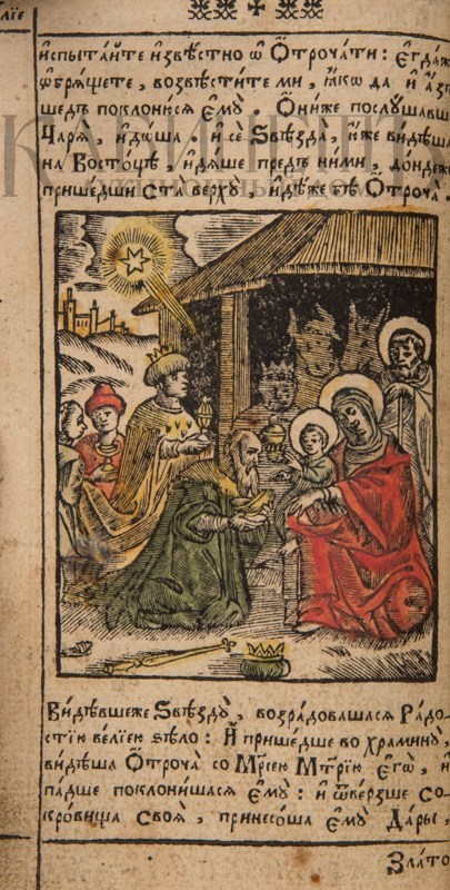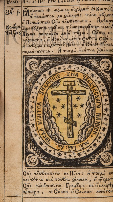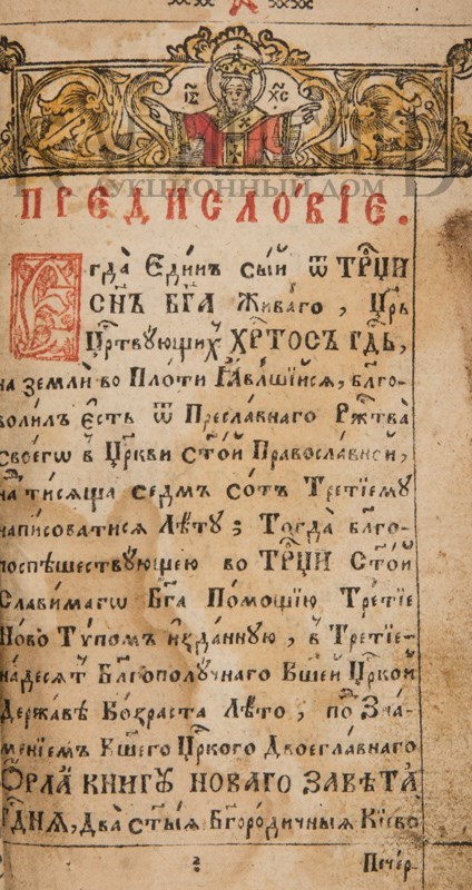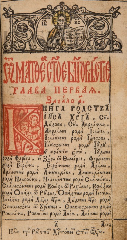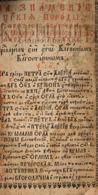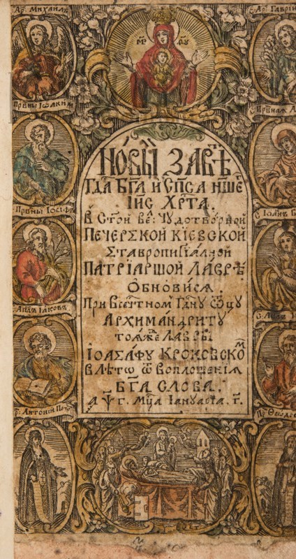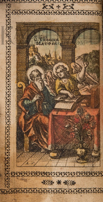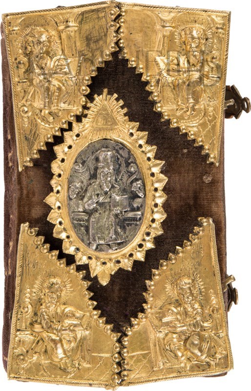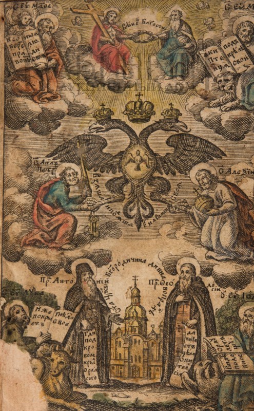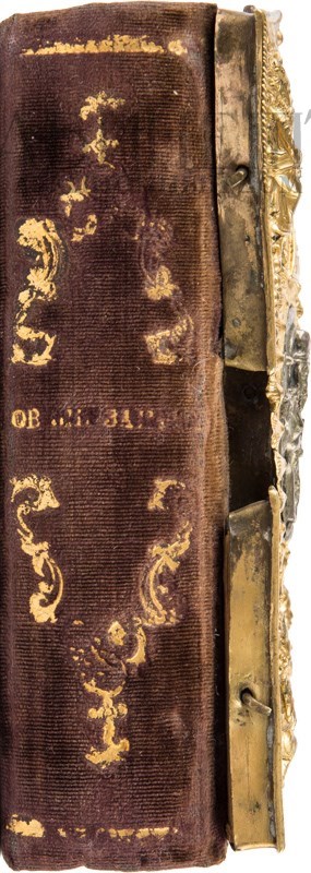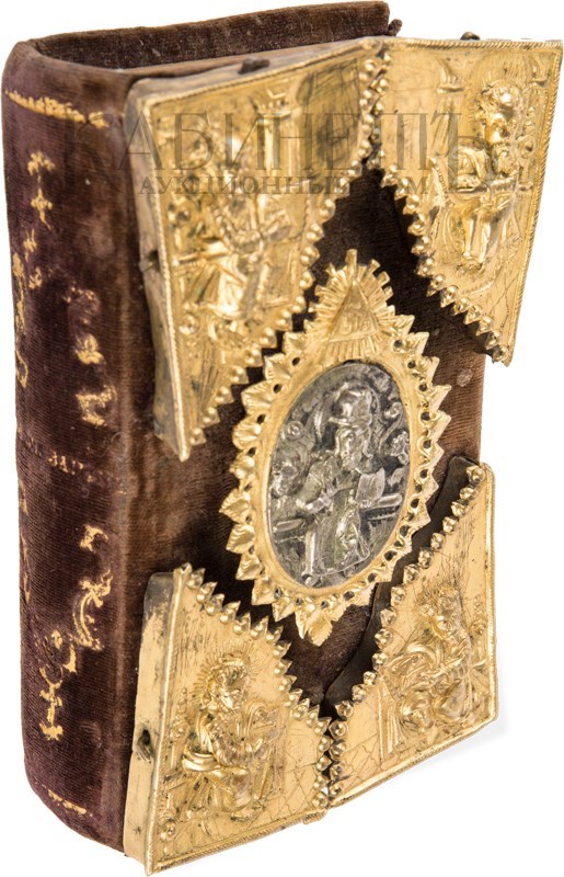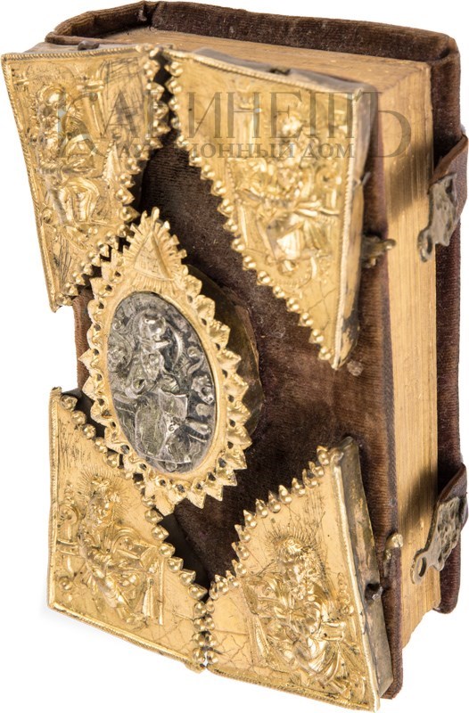 Экземпляр в старинном бархатном переплете середины XIX века с пятью латунными накладками, форзацы и титульный лист реставрированы, в середине вставлены 4 более поздних листа, 3-й золотой тисненый обрез и раскраска акварелью выполнены также в середине XIX века. Утрачены: стр. 18 – первого счета, стр. 181 –400, 438 второго счета. Незначительный разлом внутри книги по корешку, загрязнения страниц, пятна от воска, несколько страниц реставрированы – нарощены края. Смотри: Ундольский. №1332.