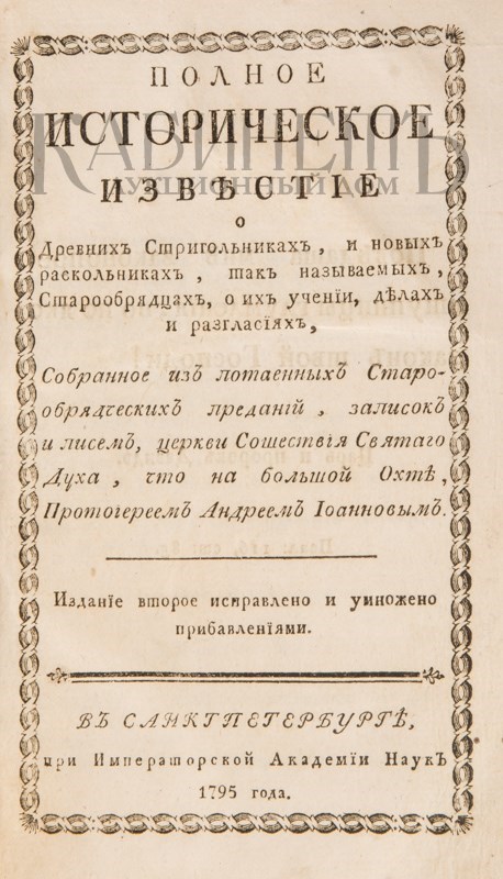 Архив аукциона №28(80) Лот 5 Журавлев А.И. Полное историческое известие о древних стригольниках, и новых раскольниках, так