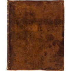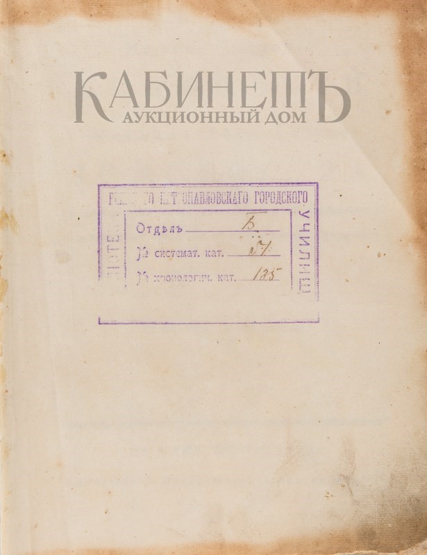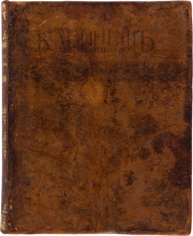 Экземпляр в старинном цельнокожаном переплете, корешок современный восстановленный с золотым тиснением. На форзаце расположен дореволюционный штамп. Пятна от воды, потертости.