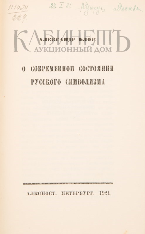 Блок А. О современном состоянии русского символизма. Пг., «Алконост», 1921.