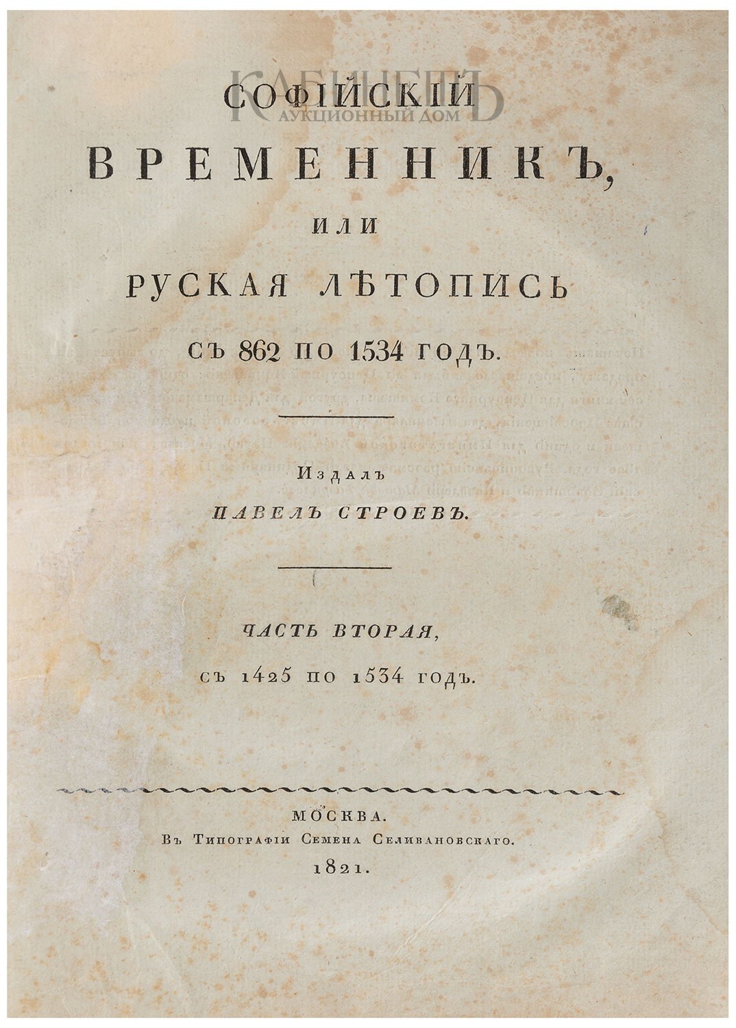 Экземпляр в современном полукожаном переплете с золотым тиснением по корешку и крышкам, незначительное загрязнение страниц, утрачен заглавный лист. Софийский временник – летописный свод, составленный при Софийском соборе в Новгороде. Фрагменты временника сохранились в текстах позднейших летописных сводов. По мнению некоторых учёных, временник был составлен около 1432 года Матвеем Михайловым, включившим в летопись ряд записей о своих семейных делах. В начале «Софийского временника» были помещены отрывки из летописного памятника более древнего, чем «Повесть временных лет», – так называемого Начального свода. Строев Павел Михайлович (1796–1876) – русский историк, археограф и библиограф, академик Императорской Санкт-Петербургской академии наук.