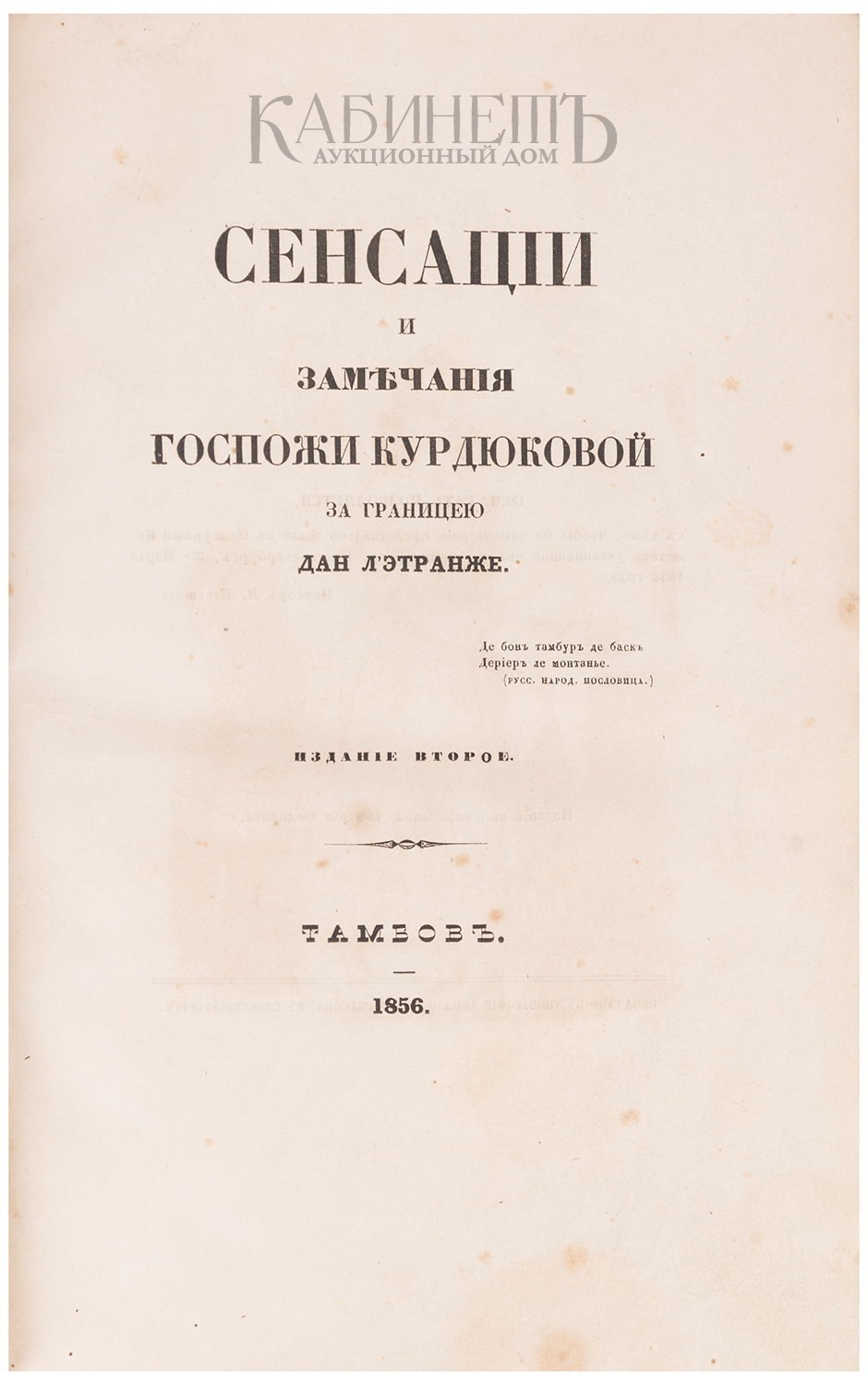 Мятлев И.П. Сенсации и замечания госпожи Курдюковой за границею, Дан л’Этранже. Издание второе. В 3-х томах в одной книге. Тамбов [СПб.], издание книгопродавца Дмитрия Федорова, Типография Аполлона Фридрихсона, 1856.