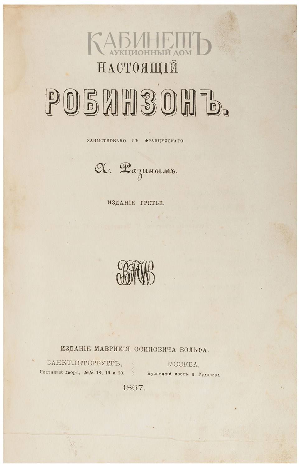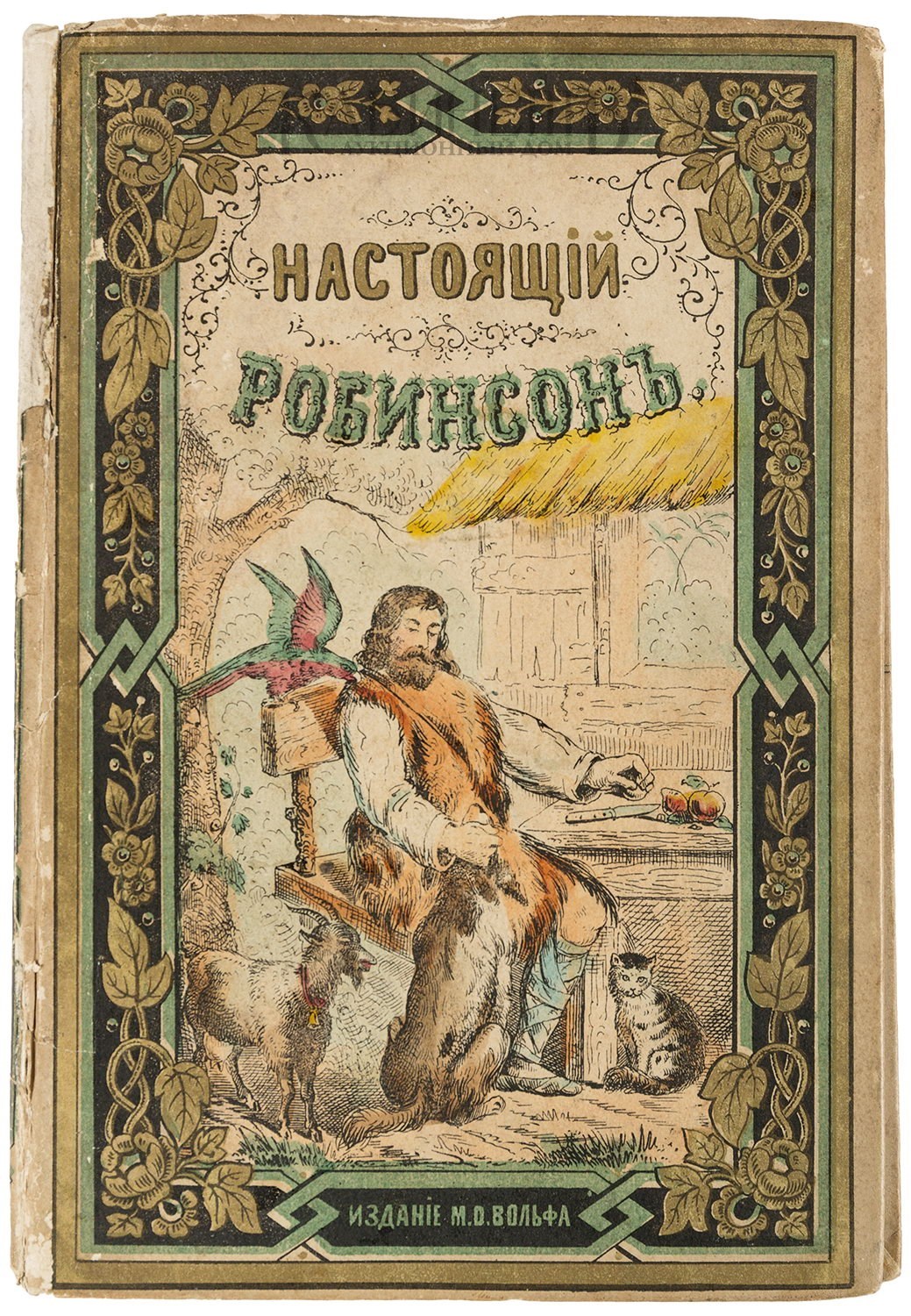Экземпляр в издательском картонажном переплете, незначительные загрязнения, фрагментарные утраты по корешку, потертости. На авантитул наклеен владельческий экслибрис. Перед титульным листом, вклеен лист с наградной надписью ученику уездного училища (1870 г.).