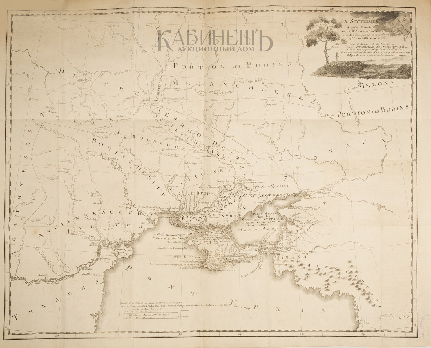 La Scythique d'apres Herodote de puis 1800 ans avant notre ere avec des changemens successifs ius qu'a l'an 1800 de notre ere / pour l'histoire de la Tauride de Stanislas Sestrencewicz. [На фр. яз.] [Париж], 1800-е гг. 51 х 60 см (лист) Бумага, гравюра на меди. В верхнем правом углу фигурный картуш с выходными данными. В низу масштабная шкала.