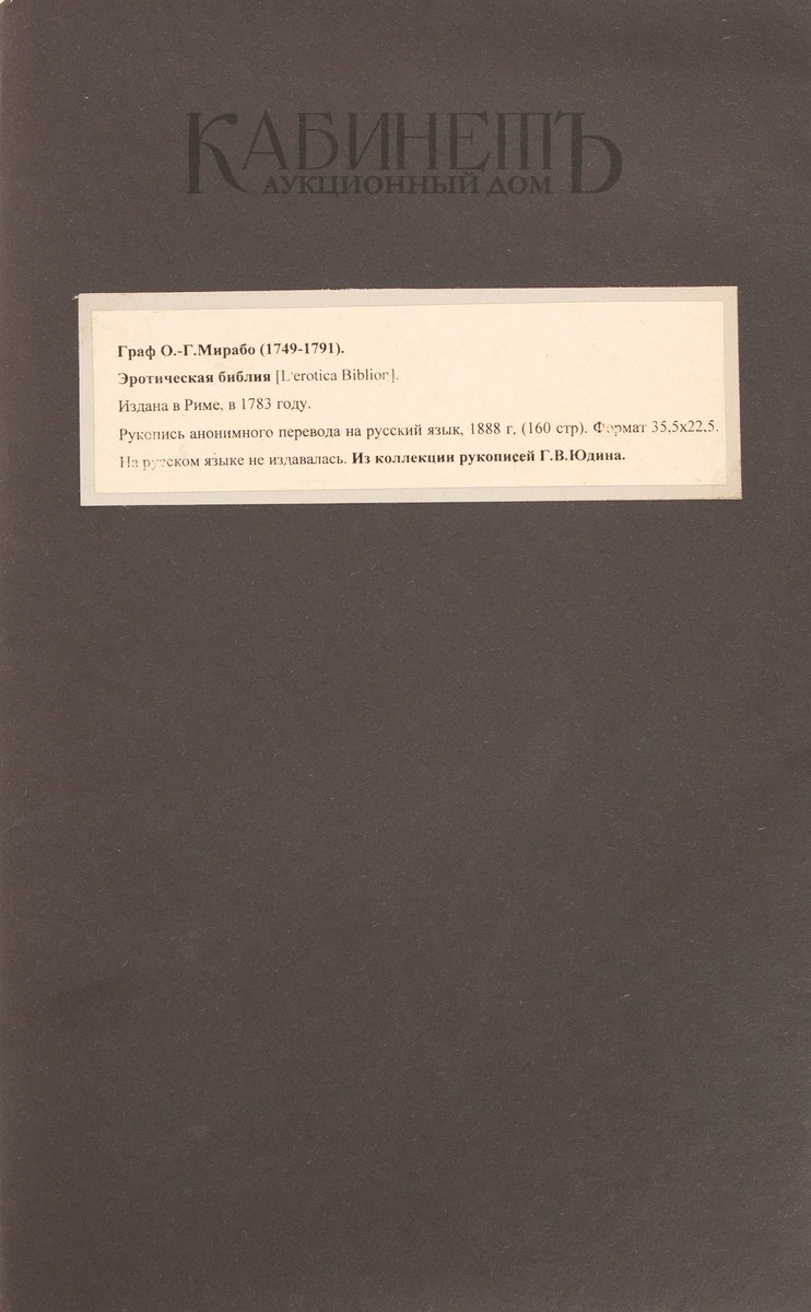 «L’Erotika Biblion» (Эротическая Библия) — непристойная книга одного из самых знаменитых ораторов и политических деятелей Франции Оноре Габриэля Рикетти, графа де Мирабо (1749-1791). В молодости, насолив немалому количеству высокопоставленных лиц, умыкнув жену у маркиза де Моннье, бунтарь попал в руки правосудия и оказался заточен в Венсеннский замок, где провел более трех лет. С трудом вынося безделье, узник взялся за переводы из Тацита, Гомера, Боккаччо, а кроме того, написал несколько томов страстных писем к своей возлюбленной и ряд произведений, которые впоследствии живо заинтересовали Пьера Луиса и Гийома Аполлинера. Это романы «Мое обращение, или Образцовый либертен» [«Ма conversion, ou Le libertin de qualité»]; «Поднятый занавес, или Воспитание Лауры» [«Le Rideau levé ou L’Education de Laure»], а также сборник «L’Erotika Biblion», составленный из 11 новелл. Мирабо впервые издал «L’Erotika Biblion» в Риме в 1783 г. Книга в России никогда не издавалась.