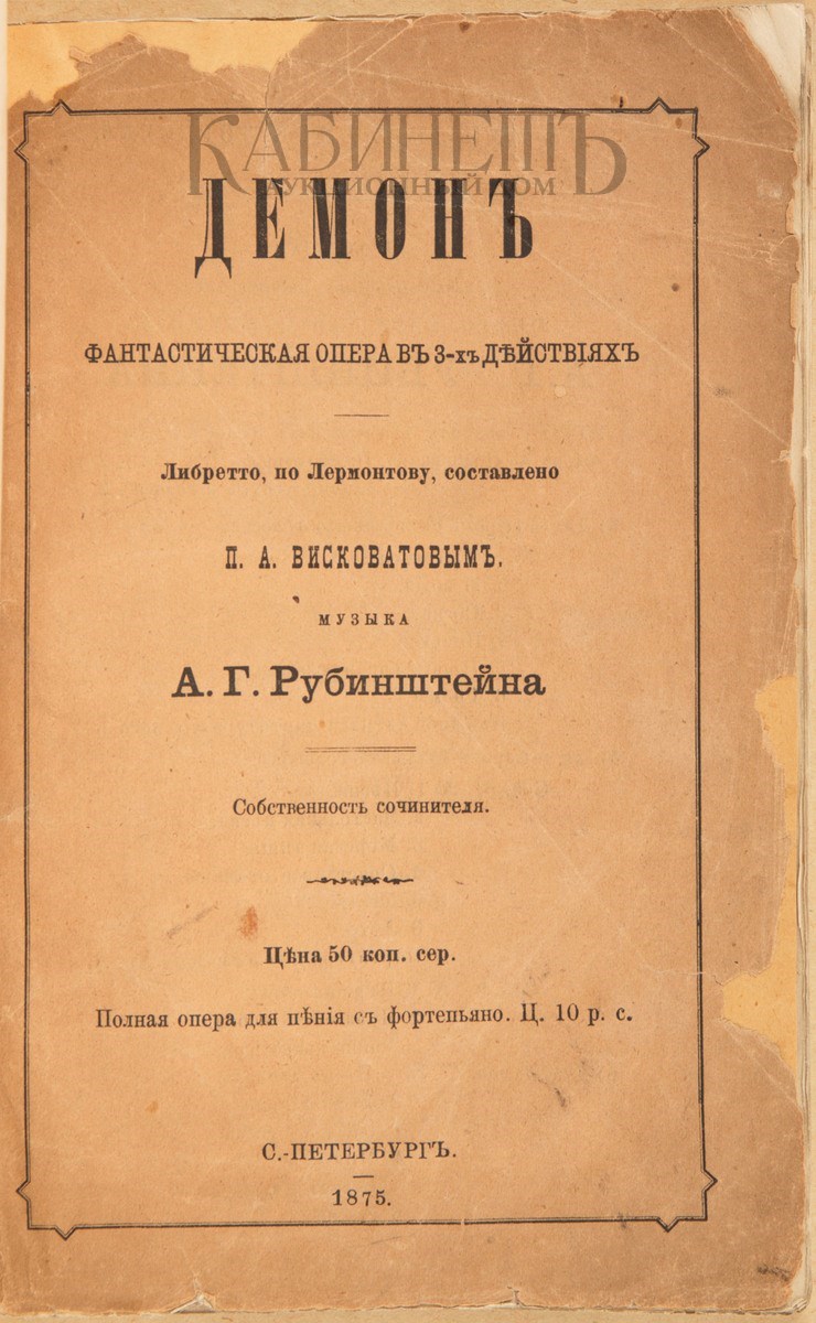 Кн. 2: Рубенштейн, А., Висковатов, П. Демон. Фантастическая опера в 3-х действиях / либретто по Лермонтову составлено П. Висковатовым, музыка А. Рубенштейна. СПб.: Собственность сочинителя, Типография В. Пратц, 1875. 48 с., 1 л. портрет (фронт) 21 х 13 см.