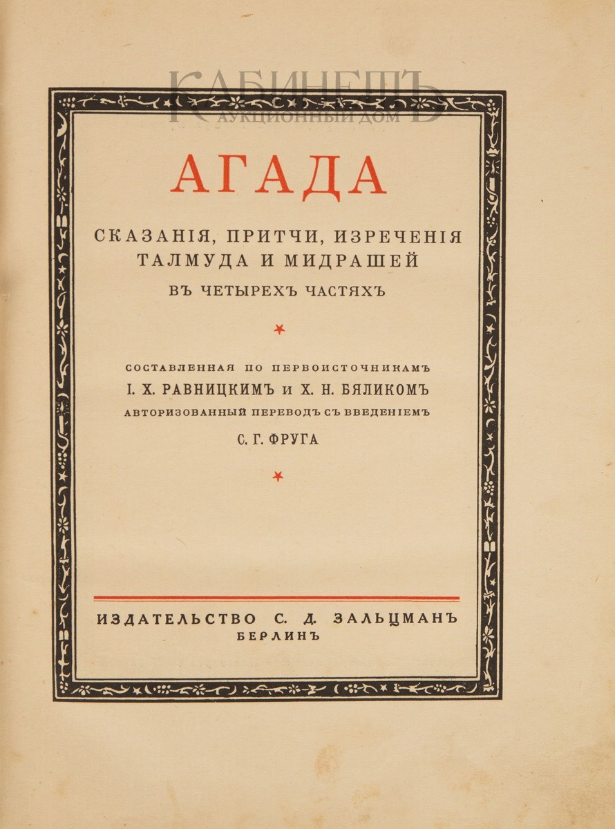 «Агада» – большая область талмудической литературы, содержащая афоризмы, исторические предания и легенды, долженствующие облегчить применение «кодекса законов» - галахи. В сборнике собрана большая часть легенд, притчей и афоризмов, рассеянных на страницах обоих Талмудов (Палестинского и Вавилонского), Мидрашей и пр. Один из авторов этого издания – Хаим Нахман Бялик – крупнейший представитель гебраистской (на древнееврейском языке) литературы начала века.