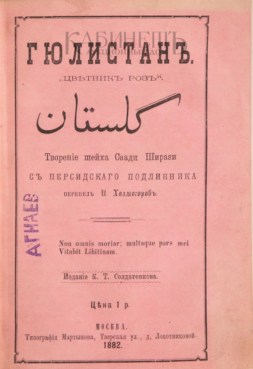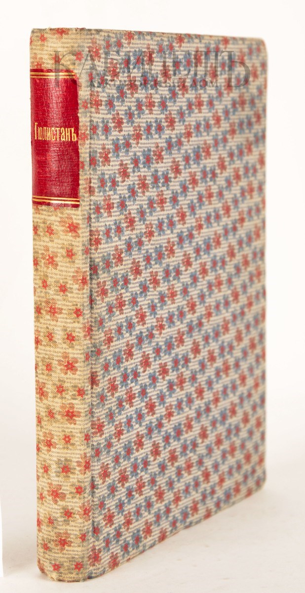 Саади Гюлистан. «Цветник роз». Творение шейха Мослихуддина Саади Ширазского / с персидского подлиника пер. И. Холмогоров. М.: Издание К. Солдатенкова, Типография Мартынова, 1882. [4], 353 с. 20 х 13 см. Во владельческом ситцевом переплете начала XX века с кожаной наклейкой с золотым тиснением. С сохранением издательских обложек. На верхней части издательской обложки штемпельный экслибрис: «Агнаев». В хорошей сохранности.