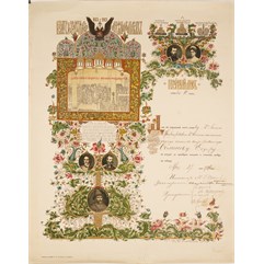 1 л. 55 х 43 см. Бумага, хромолитография. Незначительная реставрация нижнего поля. Незначительные «лисьи» пятна. Кроме портретов императоров, на хромолитографии помещена миниатюра «Венчание на царство Михаила Феодоровича».