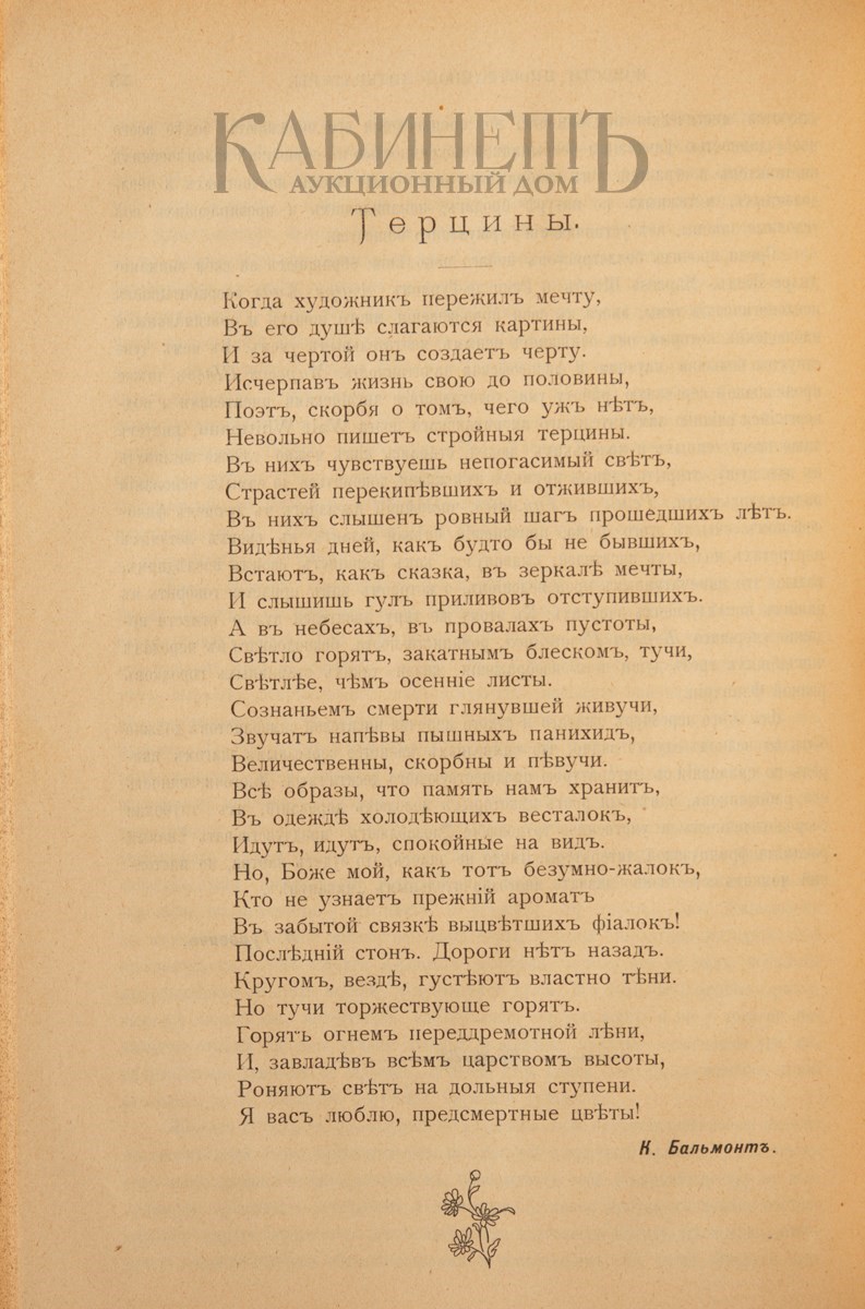 Первая публикация стихотворения К.Д. Бальмонта «Терцины», вошедшее позднее в цикл «Сознание, с. 55 (второго счета).