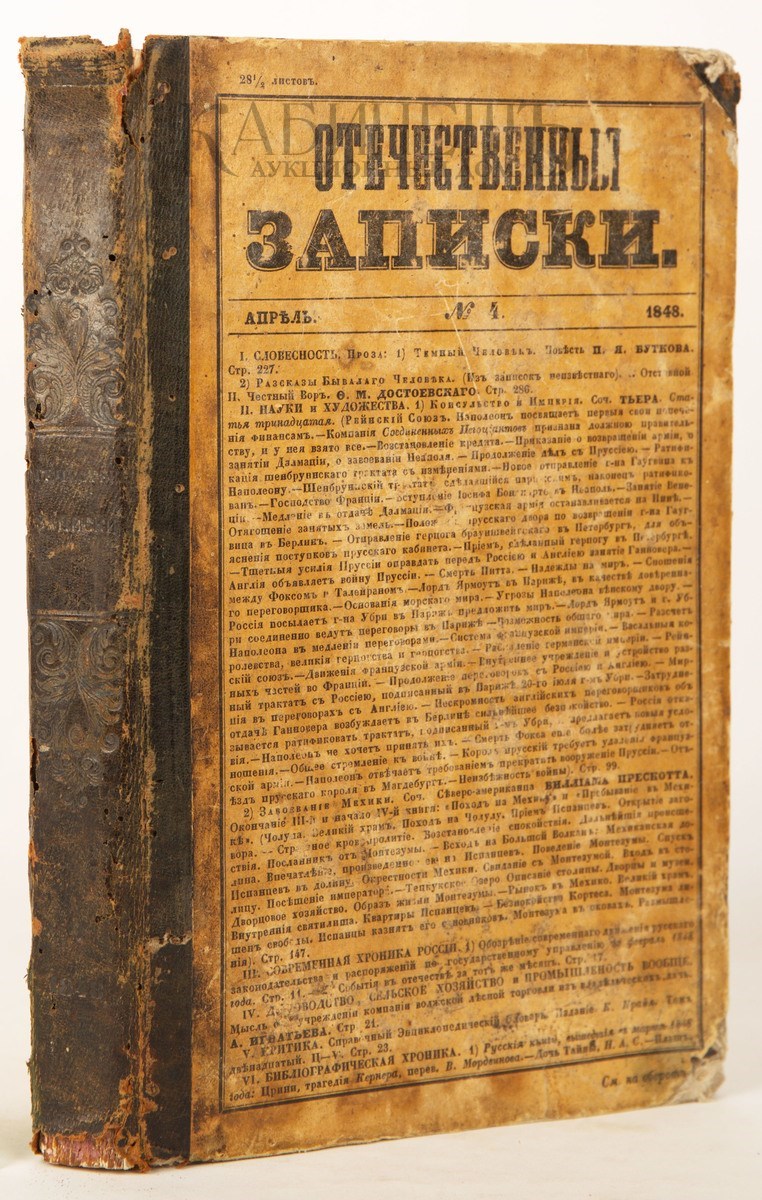 [Первая публикация рассказов Ф.М. Достоевского «Рассказы бывалого человека. (Из записок неизвестного). I. Отставной. II. Честный вор». Из собрания библиофила Л. Глезера]. Отечественные записки, учено-литературный журнал / издаваемый Андреем Краевским. № 4 апрель. СПб.: Тип. И. Глазунова и Комп., 1848.