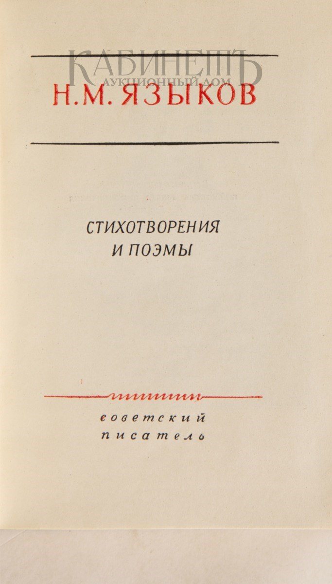 Архив аукциона №38(109) [Автограф составителя. Из собрания Л.Я. Гинзбург] Языков, Н. М. Стихотворения и поэмы / вступительная статья, подготовка текста и примечания К. Бухмейера. 3-е изд. Л.: Советский писатель, 1958.