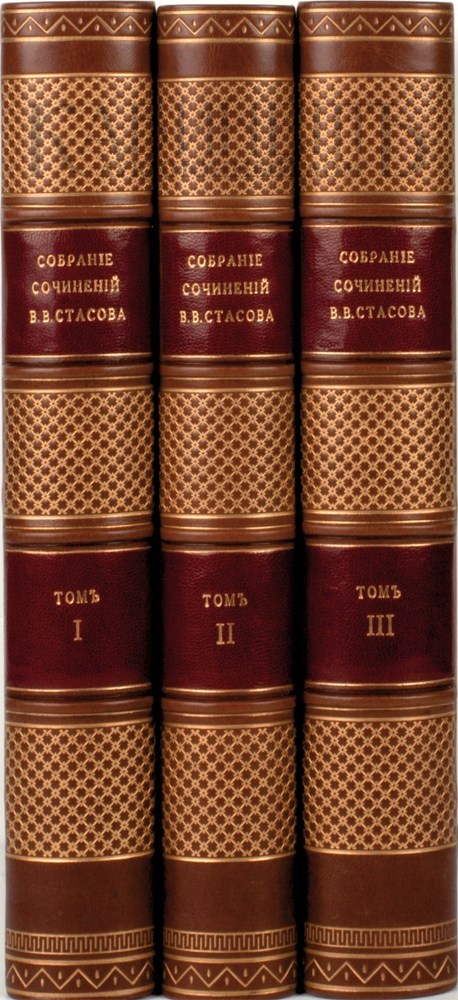 Экземпляр в современном полукожаном переплете с золотым тиснением по корешкам и крышкам, в первом томе расположен офорт В. Мате по рисунку И. Репина с портретом В.В. Стасова.