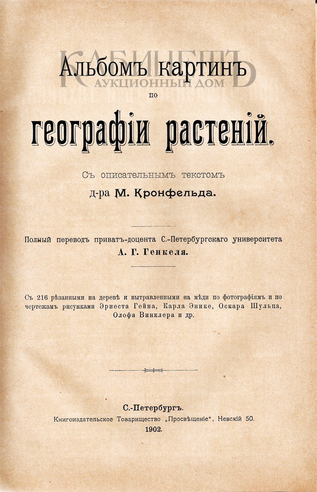 Архив аукциона №9(40) Лот 133 Кронфельд. Альбом картин по географии растений с описательным текстом. С 216 резанными на дереве и вытравленными на меди по фотографиям и по чертежам рисунками Гейна Э., Энике К., Шульца О., Винклера О. СПб., Книгоиздательское Товарищество «Просвещение», 1902.