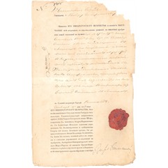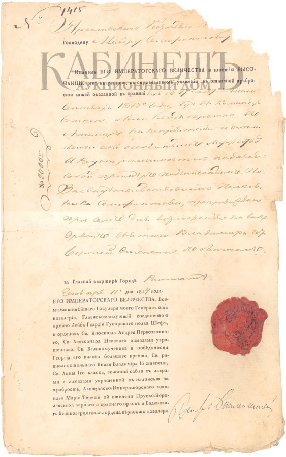 Приказ № 2000 от 11 января 1814 года о награждении майора Селифонтова орденом Святого Владимира 4-й степени с бантом за храбрость, оказанную в сражениях с 17 по 29 сентября 1813 года, с собственноручной подписью и оттиском личной печати генерала от кавалерии, главнокомандующего соединенной армией Петра Христиановича Витгенштейна