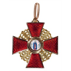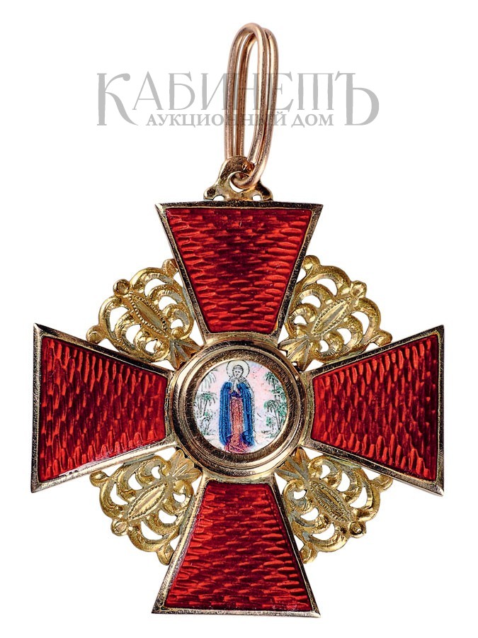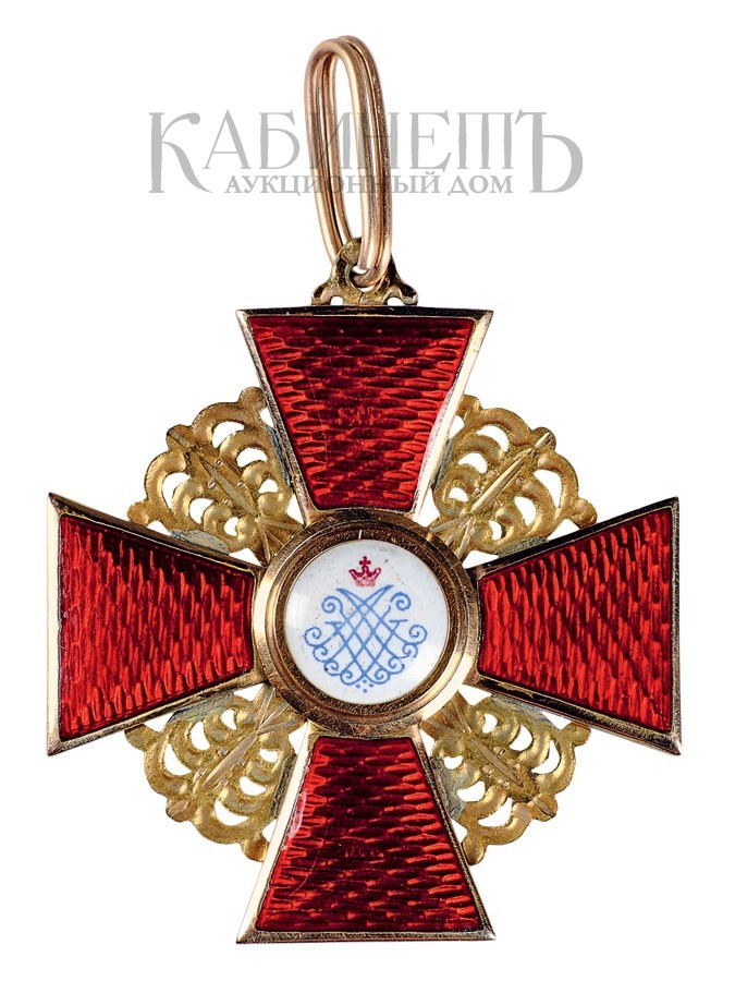 Клейма: на оборотной стороне на ушке – остатки пробирного клейма с буквой «альфа»; на верхнем луче – именник «ВД» под эмалью, на нижнем – развернутое клеймо фирмы «Эдуардъ».