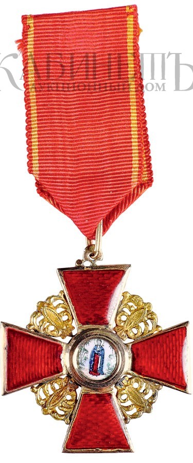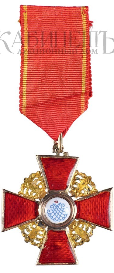 Клейма: на оборотной стороне на ушке - пробирное «56» с женской головкой, повернутой вправо, и буквой «альфа»; на верхнем луче – именник «ВД» под эмалью, на нижнем – развернутое клеймо фирмы «Эдуардъ».