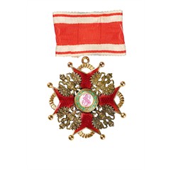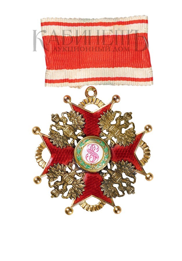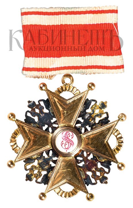 Клейма: на лицевой стороне на ушке - пробирное «56» Санкт-Петербургского окружного пробирного управления с женской головкой, повернутой вправо; на оборотной стороне на верхнем луче – остатки именника «ВД», на нижнем – развернутого именника; знаки удостоверения на шариках лучей.