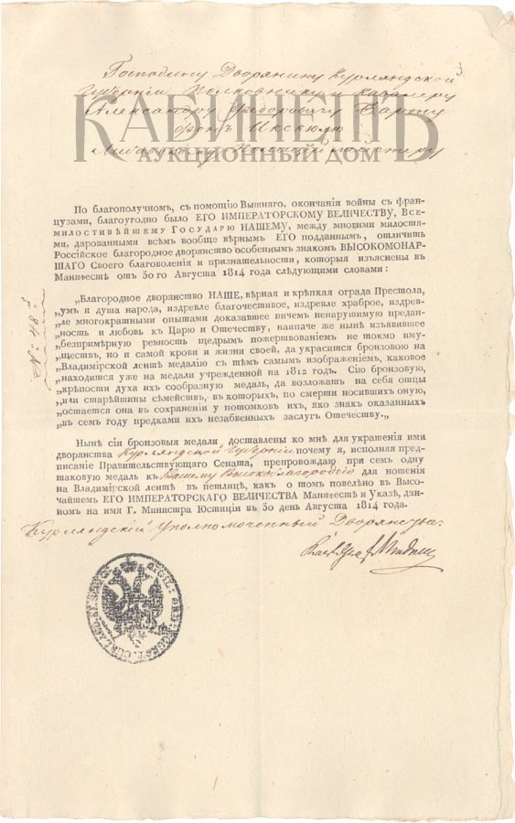 К архиву династии баронов Икскуль фон Гильденбанд относятся также лоты №№ 7, 19, 30, 45, 76, 217, 218.