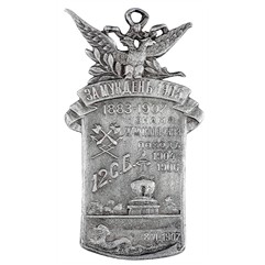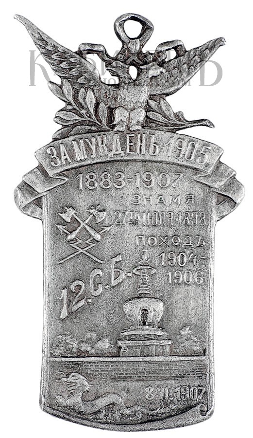 На жетоне отмечены основные знаменательные даты истории 12-го Саперного батальона. 1883 г. – дата формирования батальона из 5 рот, выделенных из Гренадерского, 1-го, 2-го, 3-го и 4-го Саперных батальонов. 8 июня 1907 г. батальону были пожалованы знаки на головные уборы с надписью: «За Мукденъ въ 1905 году», поскольку в феврале – марте 1905 г. батальон отличился в сражении под Мукденом – решающем сухопутном сражении русско-японской войны 1904–1905 гг.