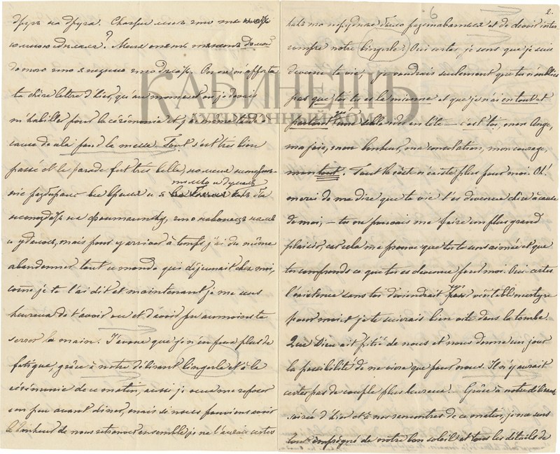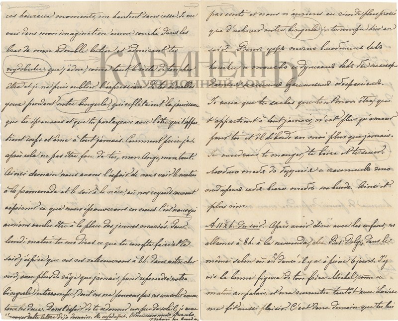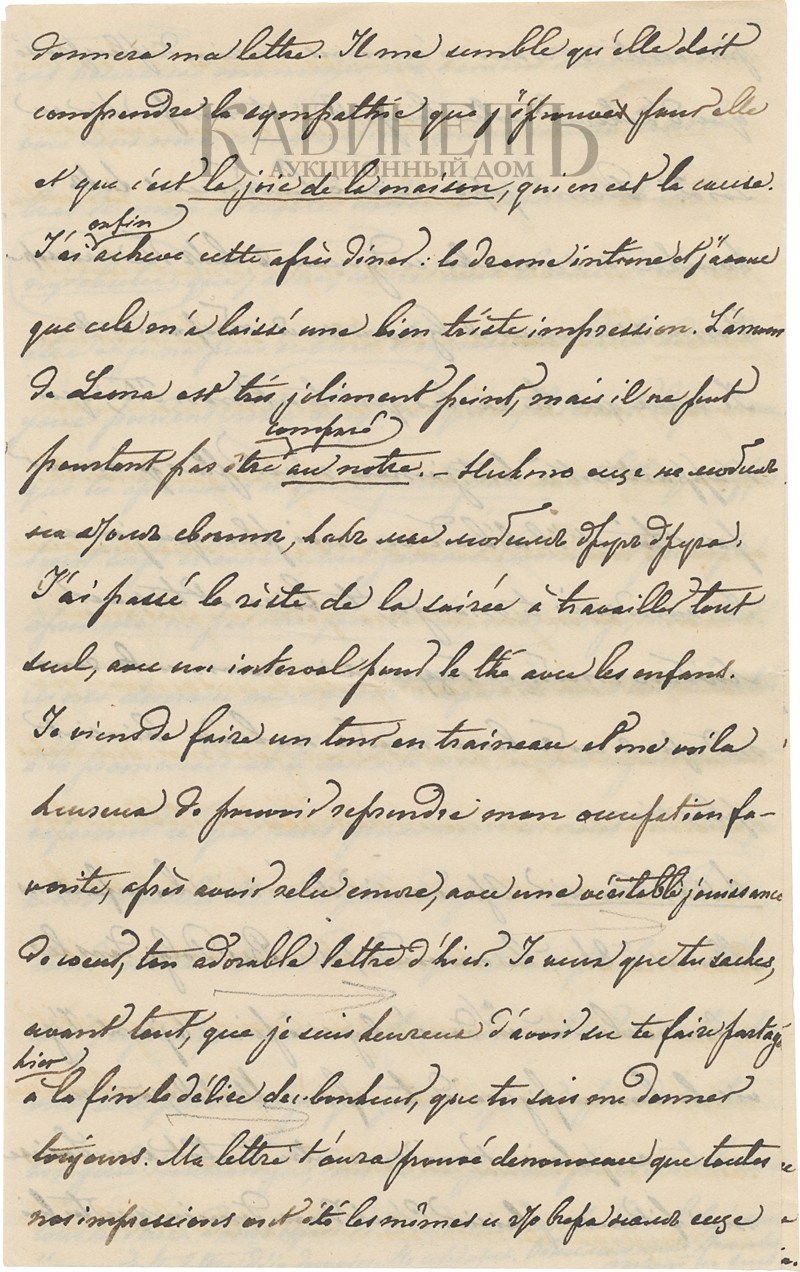 Здравствуй, мой ангел, люблю тебя больше жизни, и счастлив любить тебя, вот он, крик сердца, что принадлежит тебе навсегда, и что думает лишь о тебе и дышит лишь тобою. Жду с лихорадочным нетерпением твоего письма и не понимаю, что означает эта задержка. При этом признаюсь тебе, что нахожусь под сильным впечатлением от внезапной смерти князя Василия Долгорукого*. Мысль о подобной смерти, без возможности даже попрощаться с теми, кто дорог твоему сердцу, ничуть не утешительна. А для меня это конец 30 летней дружбы, и, несмотря на твое мнение на его счет, я знаю, что он был мне предан, и он мне это доказал, в последнюю очередь по отношению к тебе, так что я искренне о нем сожалею.