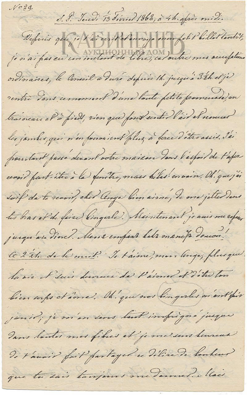 Чтобы доказать тебе, милый ангел, что я лечусь ради тебя, я не пошел на утреннюю прогулку, ибо сейчас 19 мороза, а в этот момент я имел счастье получить твое восхитительное вчерашнее письмо, каждое слово которого проникает мне прямо в сердце, и ты знаешь, что это сердце принадлежит тебе навсегда. <…>Я умоляю тебя сообщить, как ты себя чувствуешь сегодня утром, ибо страх, чтобы ты не заболела, не дает мне покоя и гнетет. Если ты почувствуешь себя плохо, заклинаю тебя не выходить на холод, хотя это и лишит меня удовольствия видеть тебя. Ради Бога, успокой меня и не оставляй меня в неведении о том, что с тобою происходит, если бы к несчастию ты занемогла. Поскольку сейчас у нас церковный праздник, я иду на мессу и буду молиться за тебя с большим пылом, чем когда-либо. Не забывай, что ты моя жизнь.
