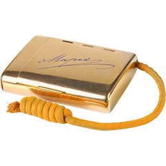 Сохранность превосходная. В отделении для спичек сохранились старинные спички. На крышке – выгравирована и покрыта синей эмалью факсимильная подпись «Марiя».