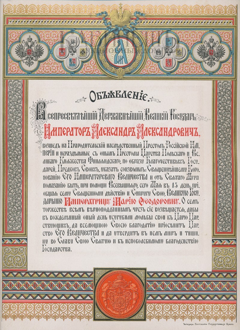 Объявление о коронации императора Александра III и императрицы Марии Федоровны 15 мая 1883 г.