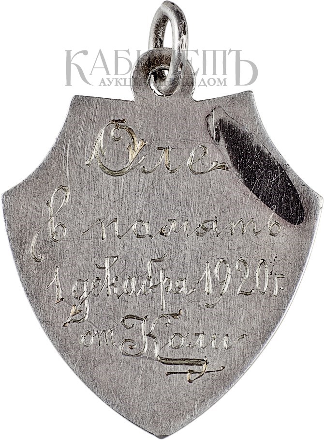 Размер 34 х 28 мм. Вес 7,91 г.Серебро. На оборотной стороне – гравированная надпись:«Оле/в память/1 декабря 1920 г./от Коли».