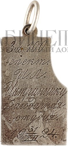 На оборотной стороне выгравирована надпись: «За 100 /спект. /И.Л. /Цитриннику /благодарная /студия./ 19 /31/ XII/24».