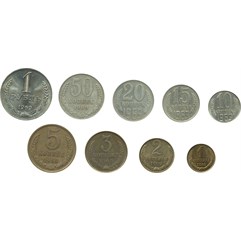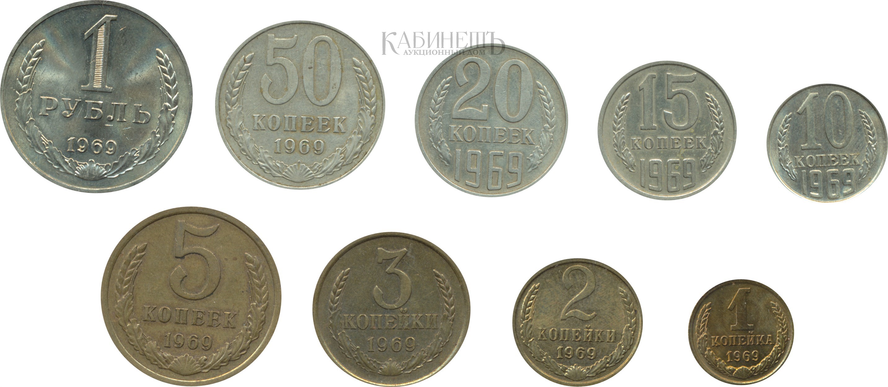 1, 2, 5, 10, 15, 20, 50 копеек и 1 рубль 1969 года.