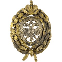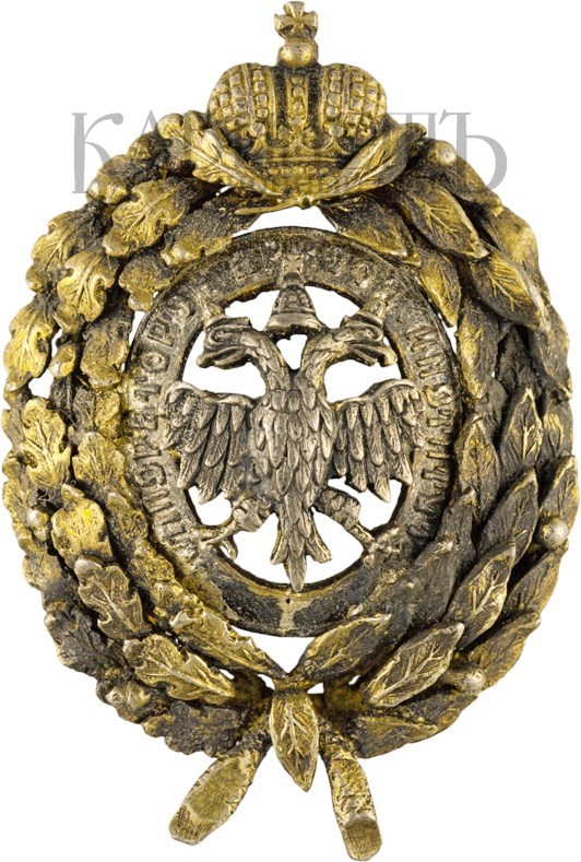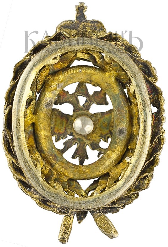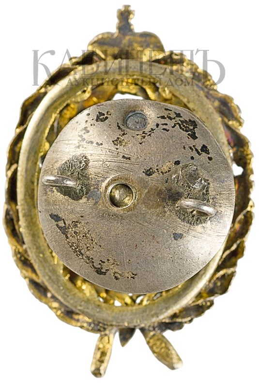 Клейма: на оборотной стороне на лентах венка – пробирное «84» Санкт-Петербургского окружного пробирного управления, для маловесных изделий из драгоценных металлов (с буквой «альфа»); именник «SK», знак удостоверения; на закрутке знак удостоверения.