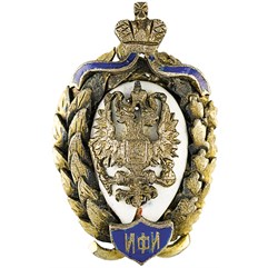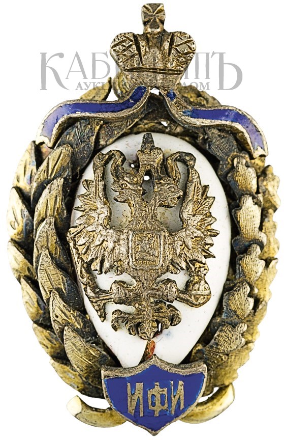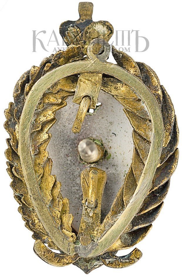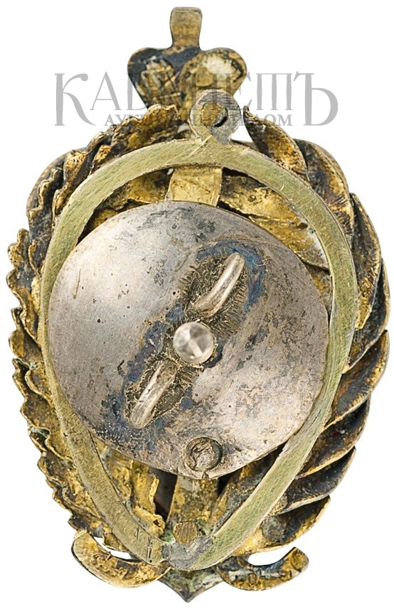 Клейма: на оборотной стороне на лентах венка – пробирное «84» для маловесных изделий из драгоценных металлов, знак удостоверения; именник «ИМ».