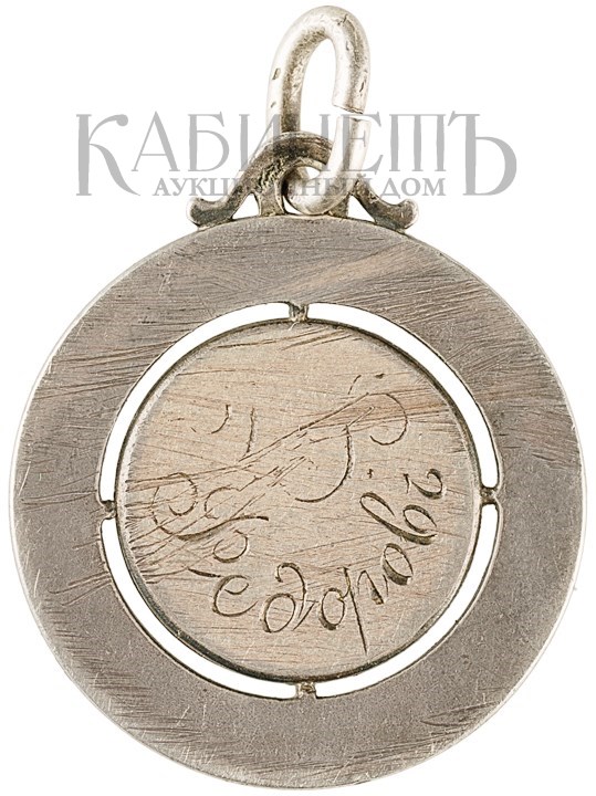 Российская империя, частная мастерская. 1902 г. Размер: 25 х 22 мм. Вес 5,79 г. Серебро, эмаль, позолота. На оборотной стороне выгравирована надпись: «Р. Федоровъ».