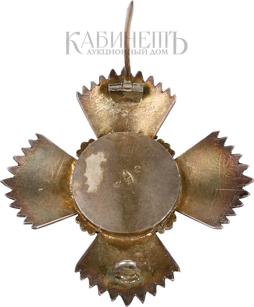 Клейма: на оборотной стороне – пробирное «84» Санкт-Петербургского окружного пробирного управления (с женской головкой в кокошнике, повернутой вправо, и буквой «альфа»); именник «АБ»; на правом и левом луче – знаки удостоверения. На заколке – именник «АБ» и знак удостоверения.