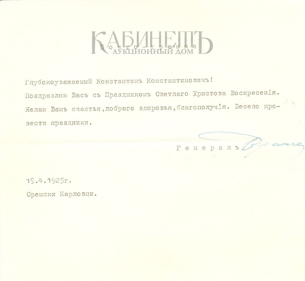 19 фотографий, 2 почтограммы за подписью генерала П.Н. Врангеля, письмо, эмалевый медальон с фотографиями.