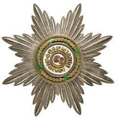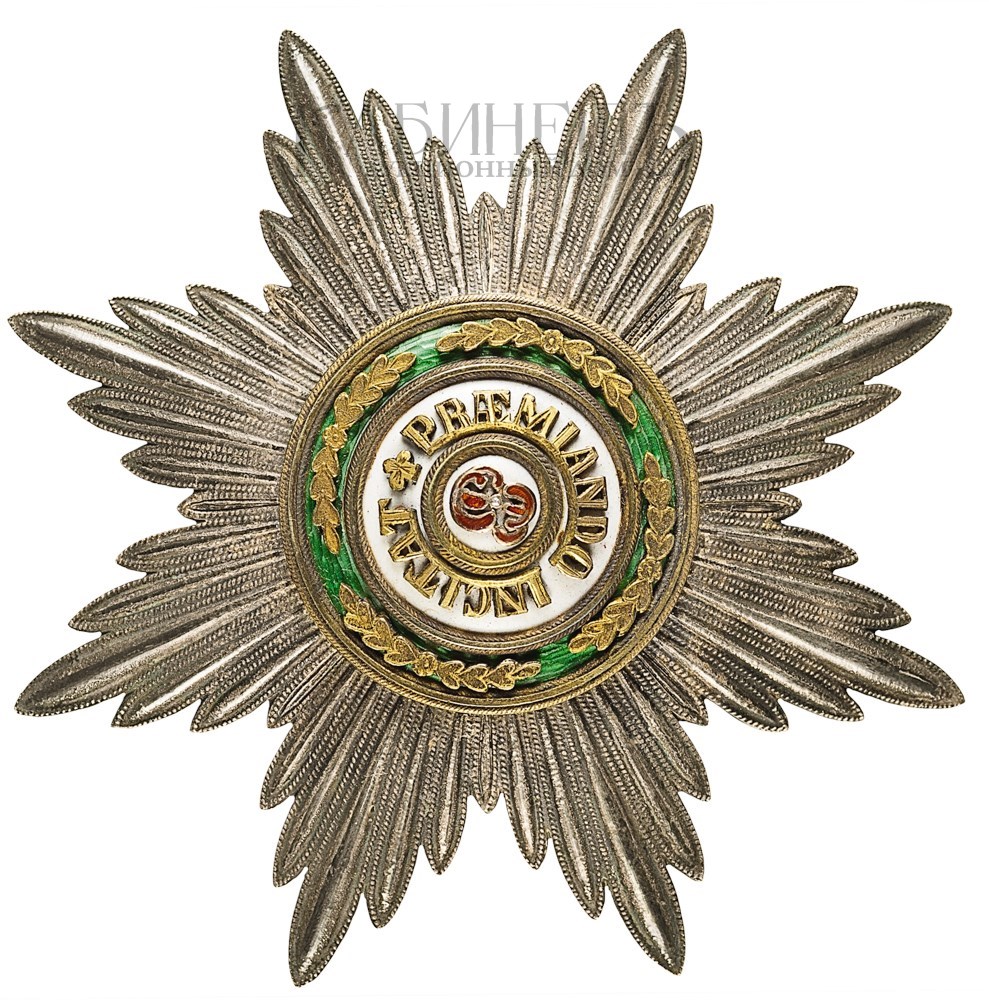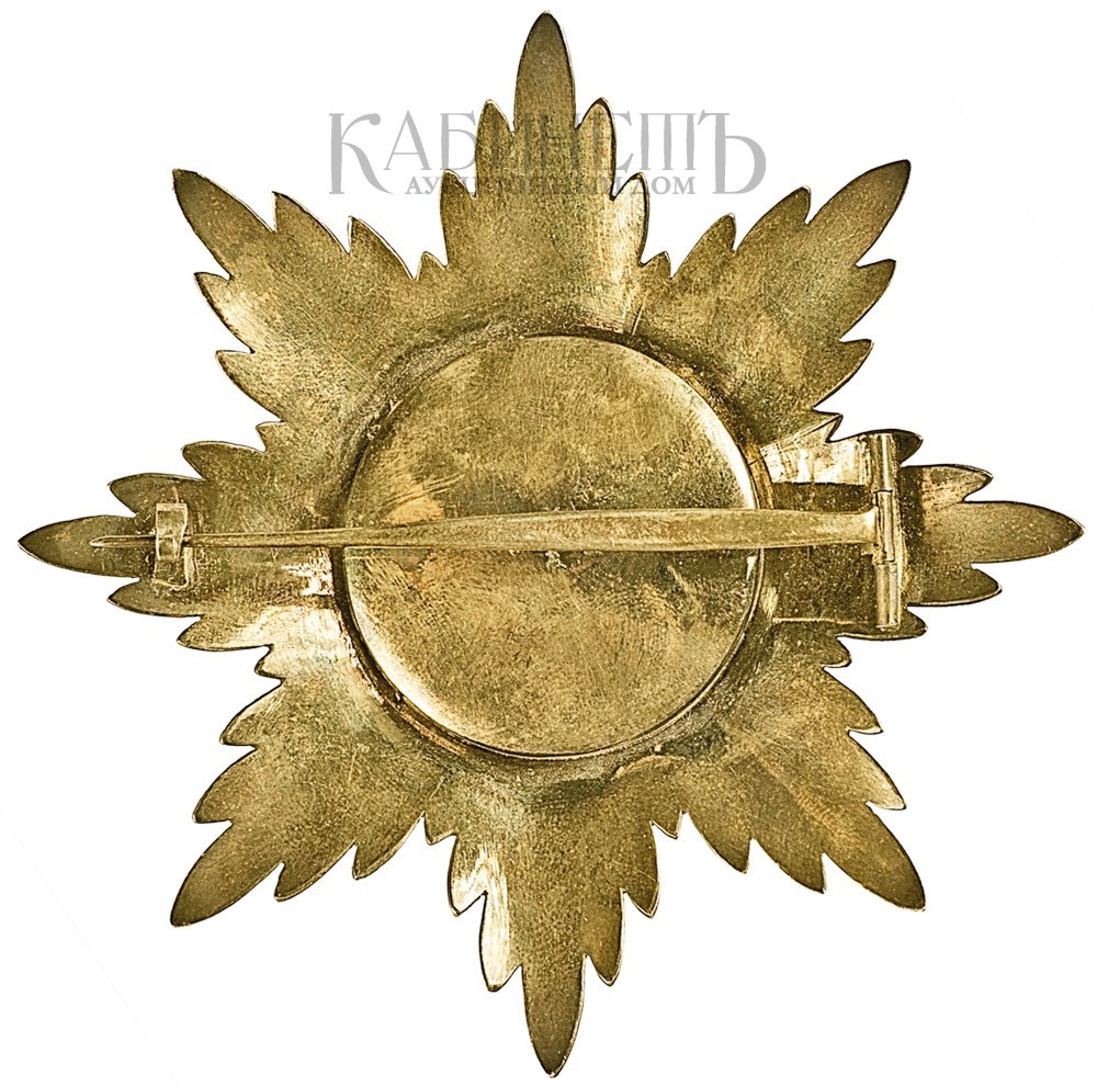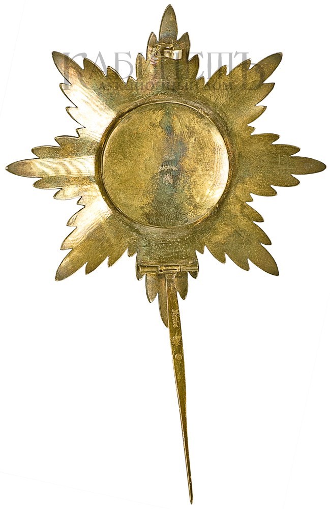 Клейма: на оборотной стороне – пробирное «84» Санкт-Петербургского окружного пробирного управления (с женской головкой в кокошнике, повернутой влево, с инициалами пробирного инспектора «АР»); развернутое клеймо «Keibel»; императорский орел (знак поставщика Кабинета Е.И.В. и Капитула Императорских и Царских орденов). На заколке – знак удостоверения, развернутое клеймо «Keibel»; императорский орел (знак поставщика Кабинета Е.И.В. и Капитула Императорских и Царских орденов).