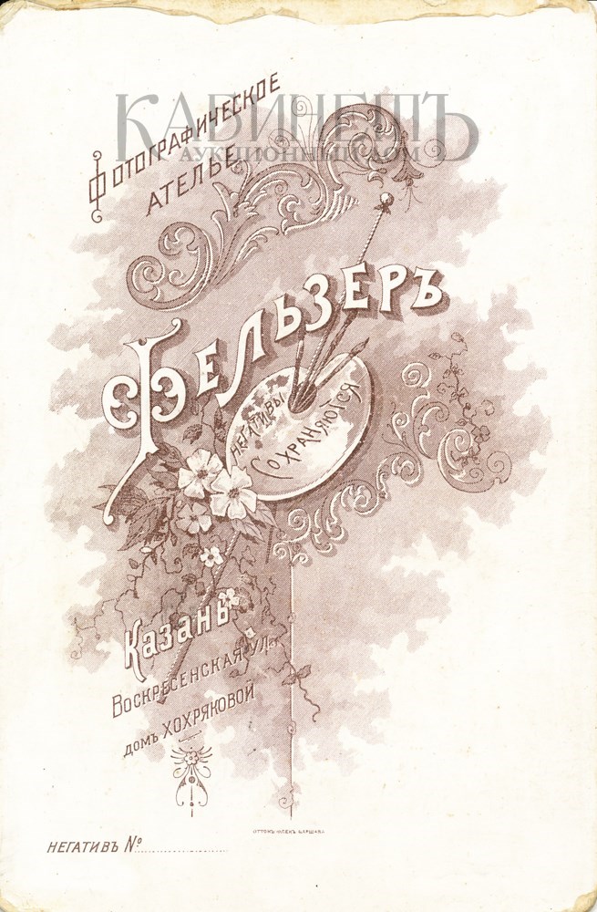 Фотография. Казань, фотоателье Фельзера. Конец XIX – начало XX в. Размер изображения: 146 х 104 мм. Размер паспарту: 165 х 109 мм